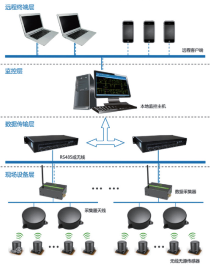 本系統由無線無源溫度傳感器、數據采集器和後台管理(lǐ)系統組成(也可(kě)采用手機(jī)APP),可(kě)視化展示各監測點及被監測設備的監測信息、評估信息及預警信息。