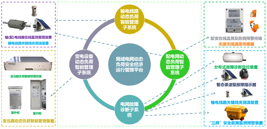 系統由“輸電線路(lù)動态負荷智能管理(lǐ)子系統”,“配電網動态負荷智能管理(lǐ)子系統”,“變電設備動态負荷智能管理(lǐ)子系統”,“電網故障診斷子系統”組成。